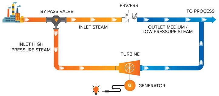 High Pressure (HP) Steam is diverted from the PRV(Pressure Reducing Valve) Inlet to the system, where useful energy available in steam can be converted into clean electricity and the low pressure steam will be available downstream for the process requirements. Ensures no interruption in existing plant process, Plant will get its desired steam temperature and pressure.